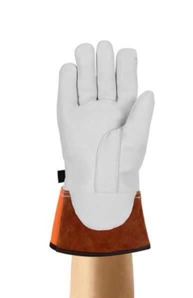 - İşçi güvenliğini ve kauçuk yalıtımlı eldivenlerin bütünlüğünü sağlamak için deri koruyucuların giyilmesi gerekmektedir.